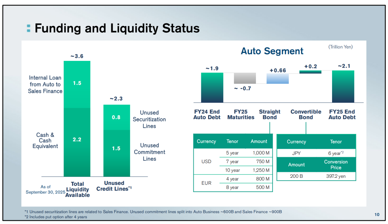 更重要的是,日产汽车当前手握约3.6万亿日元的可流动性资金,其中包括近2.2万亿日元的现金及现金等价物储备和近1.5万亿日元待偿还的销售金融公司贷款,以及未使用的信贷额度为2.3万亿日元。这一充裕的“资金储备”不仅为日产应对市场波动提供了坚实保障,更使其有能力持续投资于未来转型发展。