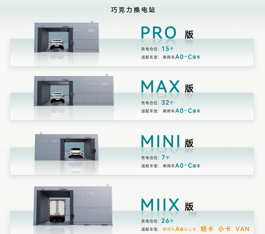 在电池与换电站方面,巧克力换电推出20号、25号、26号、35号多型号标准化电池块,适配车型可覆盖A0至C级车型,真正实现按需配电。换电站采用模块化、标准化设计,目前已推出PRO、MAX、MINI、MIIX等型号换电站,PRO站、MAX站、MINI站轴距兼容范围达2.5米至3.2米,MIIX站轴距兼容范围达2.7至3.75米,是行业内的最高水平。根据换电站的不同型号,单站可配置7-32个电池仓。